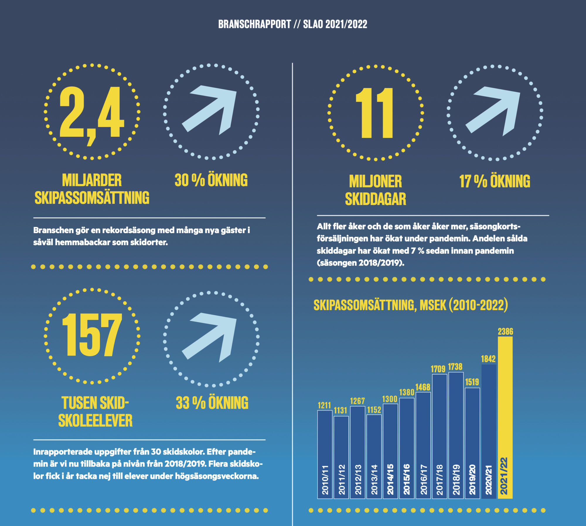 Totalt har vi svenskar lagt 2,4 miljarder kronor på liftkort i vintras och säsongen 2021/2022 är därmed en rekordsäsong för Sveriges skidanläggningar med en ökning på hela 30 procent i jämförelse med säsongen 2020/2021.
