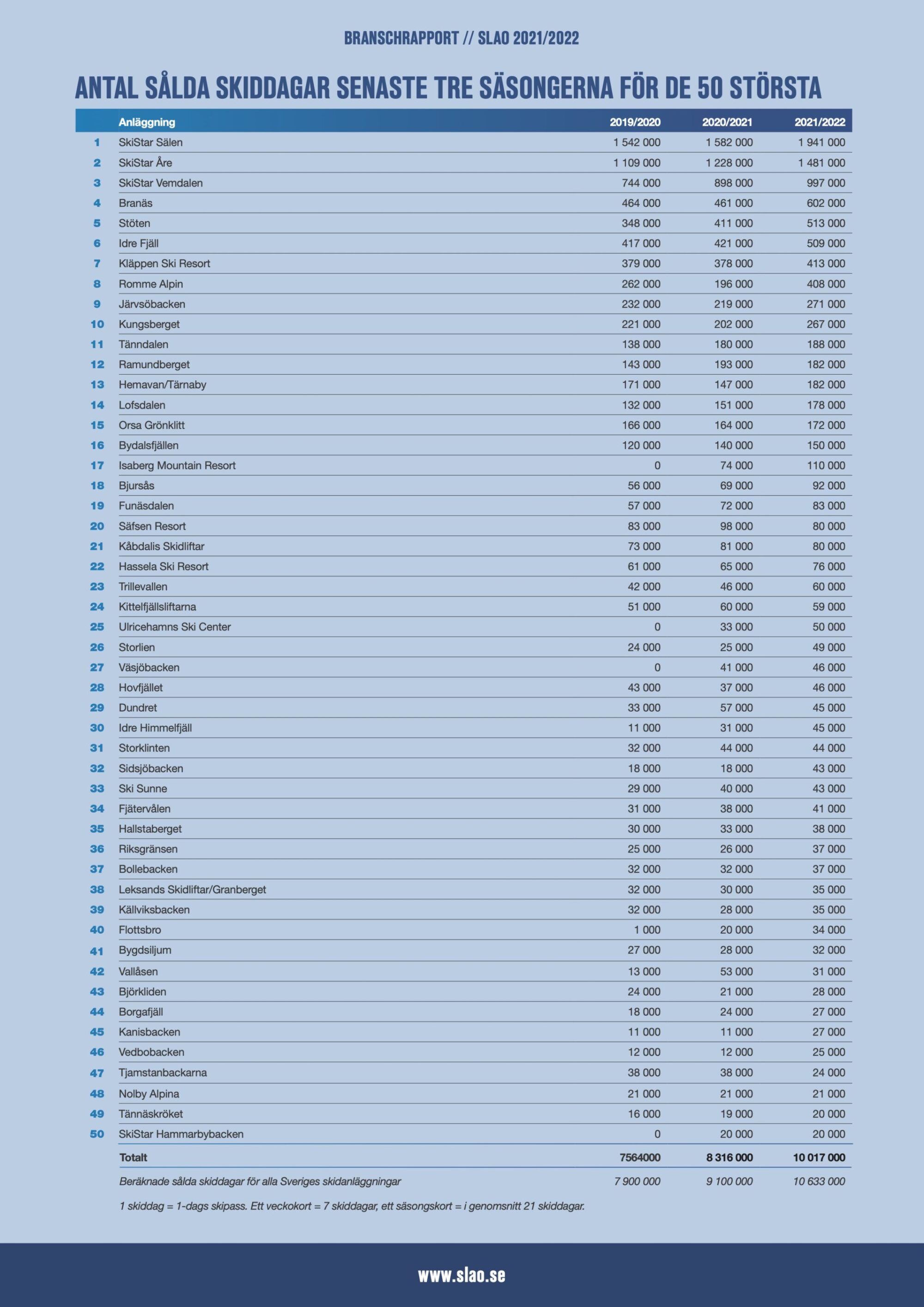 SLAO har sammanställt antal sålda skiddagar under senaste tre säsongerna (från 2019 till 2022) och nedan är listan på vilka svenska skidorter som det åks mest skidor på samt antalet dagar: