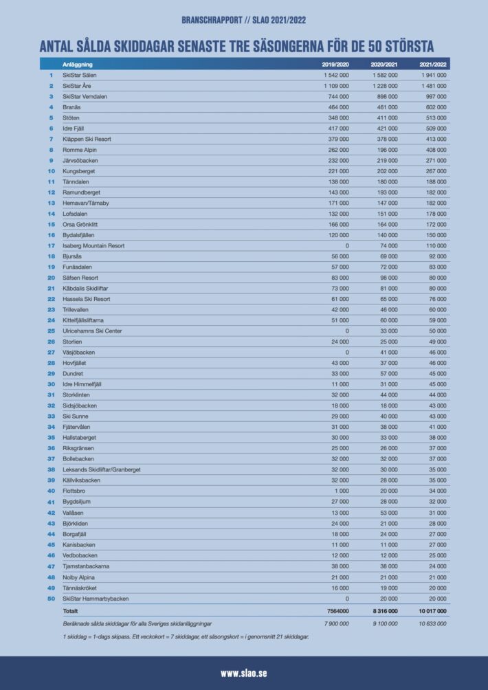 Nedan är en komplett lista över antal sålda skiddagar senaste tre säsongerna för de 50 största skidanläggningarna i Sverige: