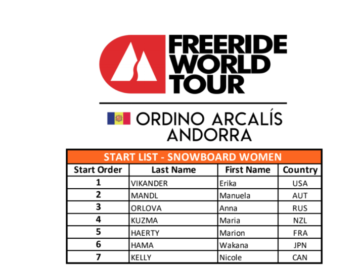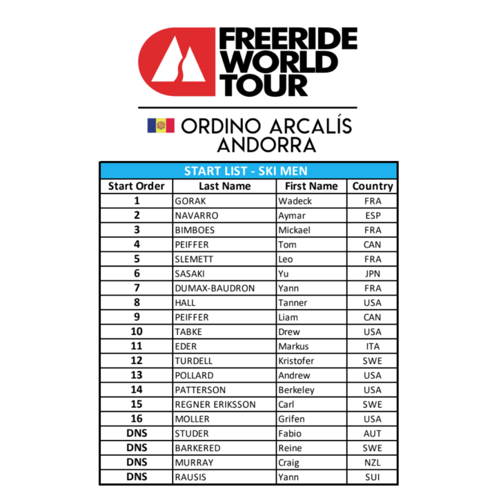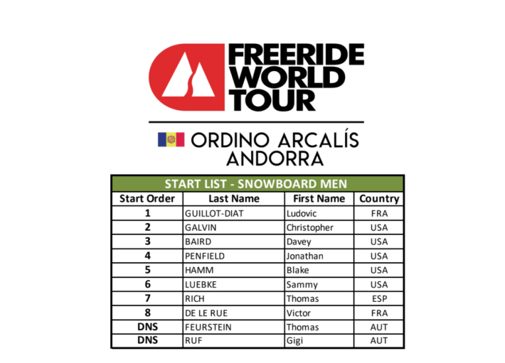Precis som i resten av Europa har ett högtryck bränt bort mycket av snön i Andorra, och vi får troligen se en tävling i variabla snöförhållanden från slush till omfruset. Första åkaren fransmannen Ludovic Guillot-Diat på bräda, för övrigt mannen som vann kvalplatsen före svenska Cody Bramwell som körde vilse i sista kvaltävlingen Obergurgl-Hochgurgl förra vintern.