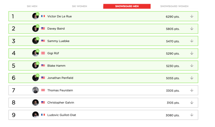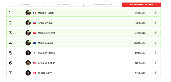 1. Snowboard Men2. Ski Men3. Snowboard Women4. Ski Women