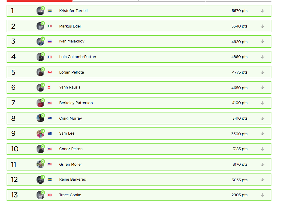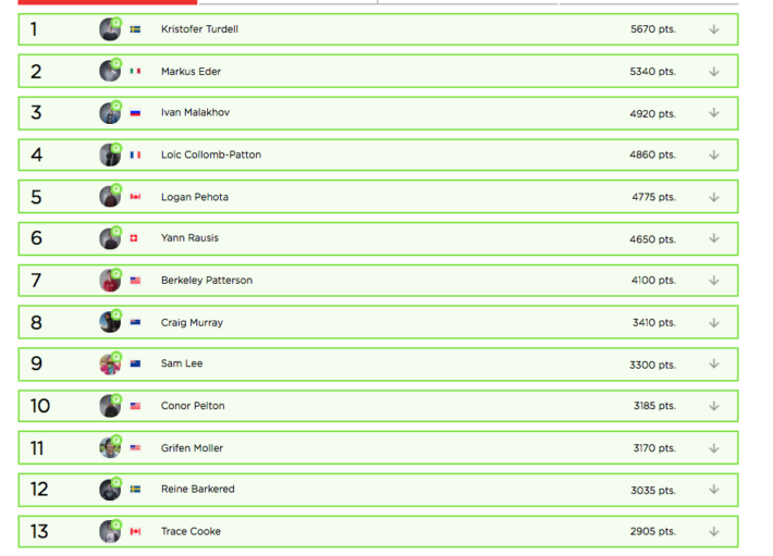 Reine Barkered ligger dallrande nära kvalstrecket med sin 12:e plats totalt i rankingen. Reine Barkered har inte riktigt kommit upp i sin bästa tävlingsform och har sviten 8-9-19 på årets tre första tävlingar. Veteranen Reine, som gör sin tionde säsong, behöver prestera i imorgon om han ska ha chansen att ta hem Le Grande Finale i Verbier som han gjorde förra vintern, vilket han dessutom gjorde i sisådär 100 km/h knyck nedför Bec des Rosses.