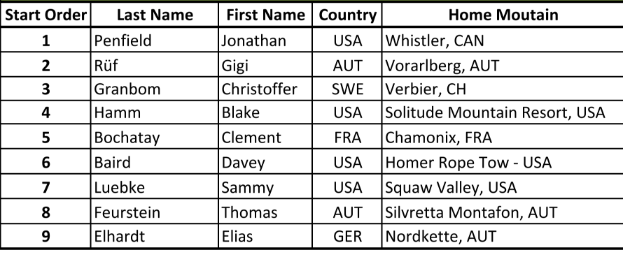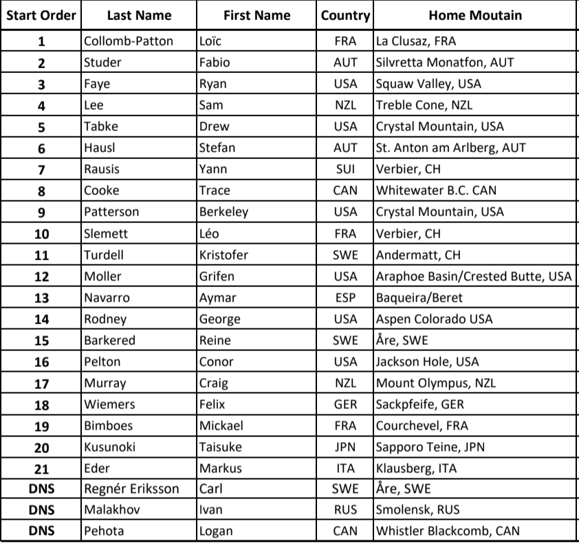 Christoffer Granbom ligger före morgondagens tävling i Fieberbrunn på fel sida kvalstrecket. Men fältet i snowbardklassen är tight och Kungälvsonen har alla chanser att med ett bra åk ta sig till finalen som går på hans hemmaplan i Verbier. I snowboard herrar har tyska Elias Elhardt fått ett wildcard för tävlingen i Fieberbrunn.