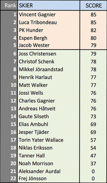 Foto: Johan CarlssonTvå svenskar är klara för finalen. Jacob Wester som kom på delad femteplats efter en perfekt dubbel cork 1260 safety to reverse tail och Henrik Harlaut som inte fick ut sin fulla potential under kvällen och hamnade en bit ner i resultatlistan, men som ändå får chansen i finalen tack vare ett wildcard. Förra årets fyra, Frej Jönsson, stod över tävlingen då han drog axeln ur led vid ett hopp tidigare i veckan.