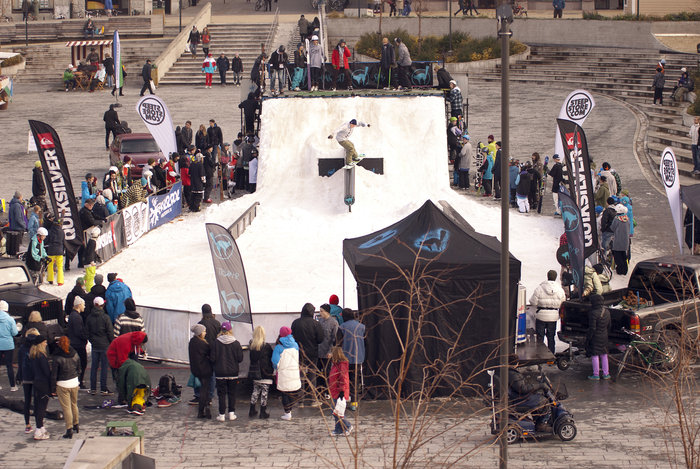 Lite mer än 80 åkare tog sig till jamet och de möttes av den kanske fetaste arenan under årets tour. Tre överfyllda lastbilar hade under morgonen leverat snö på torget och det är mer än vad som någonsin funnits under ett Make It Happen-stopp.