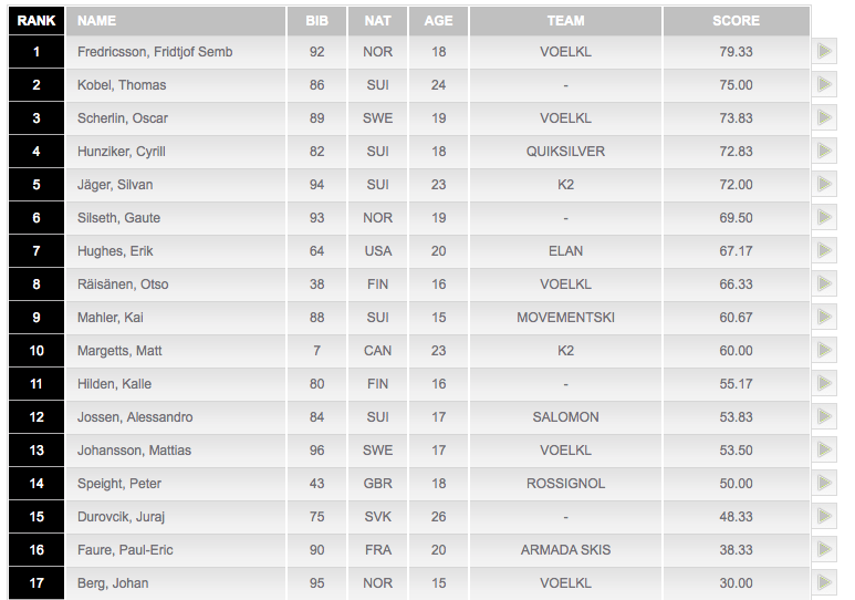 Topp 5 går vidare + de 17 åkare med högst poäng från samtliga heat (Svenska åkare som kvalade vidare: Kim Boberg, Niklas Eriksson, Morten Grape, Alexander Hebbe, Oscar Wester, Jesper Tjäder, Maximilliam Smith, Oscar Scherlin