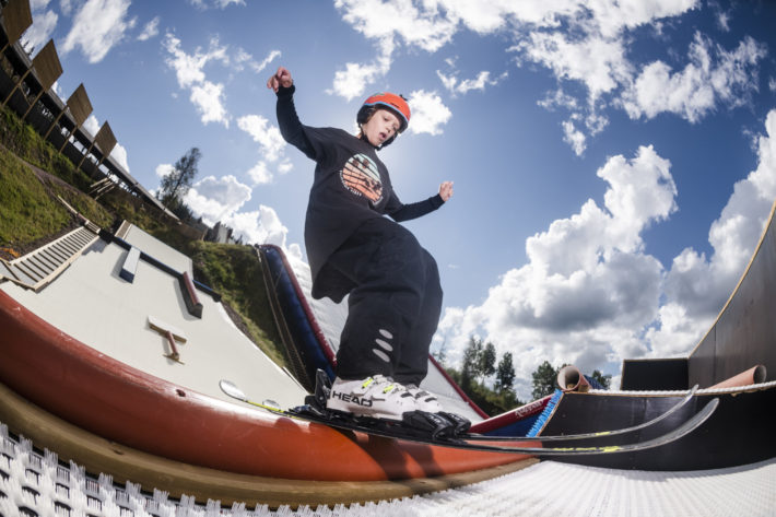 – Plastmaterialet som används som åkyta till i Kläppen Arena är så likt snö du kan komma, vilket betyder att du får fäste i skidan eller brädan som om det vore en perfekt februaridag. Låter kanske konstigt, men det är sant. Att åka på airbagen är säkert och du kan landa i princip hur som helst vilket gör att du som åkare kan fokusera 100% på teknik istället för att vara rädd för att skada sig eller landa fel. På Kläppen Arena hittar du ett rullband som lift för att komma upp till starttornet, men för att komma upp i starttornet behöver man gå upp i en trappa på ca 80 steg vilket efter en hel dags åkning blir ganska bra träning.