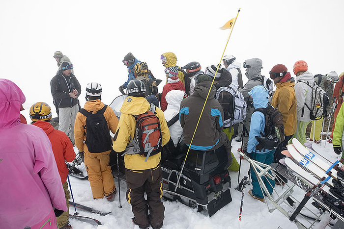 Robert Gustafsson, i svart jacka, håller briefing för åkare.