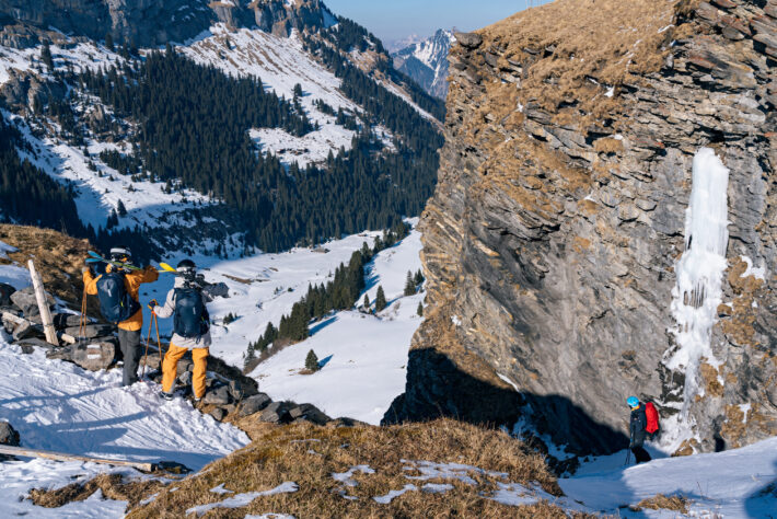Högljutt lägger vi några svängar i första bästa fält med kallsnö innan vi viker av och håller oss längs med nordsidan för mer av samma frysvara. Här kan man åka varv, efter varv, efter varv, efte va… då hela den nordsidan är ett enda stort smörgåsbord av stora fina svängar. Vill man inte skråa ut från toppen kan man ta sig längs med den nordliga kam som går ut från Schilthorn och sedan hajka 5 minuter med skidorna på ryggen över själva kammen. Här börjar Sousmänneleni med nästan lika många, om än något kortare åk, än ovan ingångspunkt. Efter att du har skrattat och svängt klart så fortsätter du ner i dalen längs med böljande kullar och utsikten har du nu på nära håll.