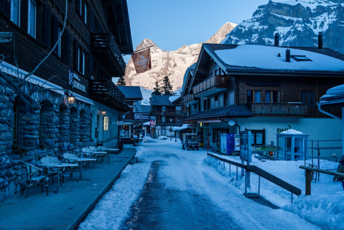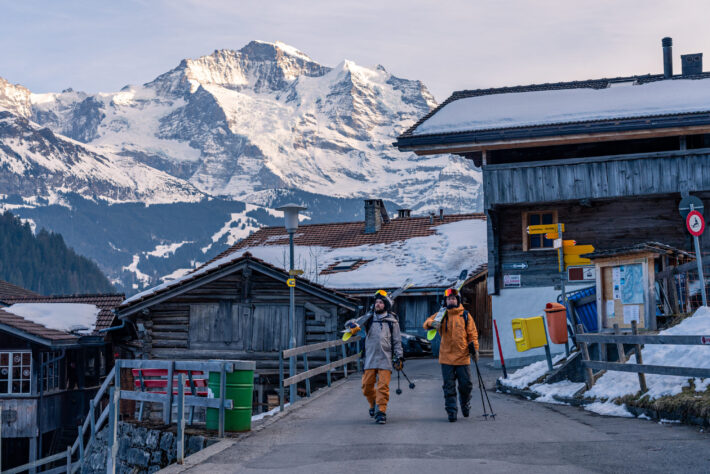 Vår elbil, som tagit oss hela vägen från Sverige, susar tyst upp för den kolasås-slingriga vägen som ska ta oss de sista 1000 fallhöjdsmeterna upp till Schilthornbahn, som har sin dalstation några kilometer efter Lauterbrunnen. Mürren ligger i schweiziska Jungfrau regionen, och är den perfekta skidorten om du verkligen ledsnat på att prioritera trängsel, lunch för minst 400 kronor, parkeringar med tillhörande p-bot och hellre prioriterar vertikal skidåkning framför nattklubbens horisontella shot-skida. För upp till Mürren kan du inte ta dig med bil då hela byn är bilfri och det finns max tre stycken nattklubbar. Genom Mürren kan du gå på ca 20 minuter – perfekt för oss “erfarna” som dåsar in i sängen vid 23:00 efter en flaska lokalt vin och laddar skidbatteriet för morgondagen.
