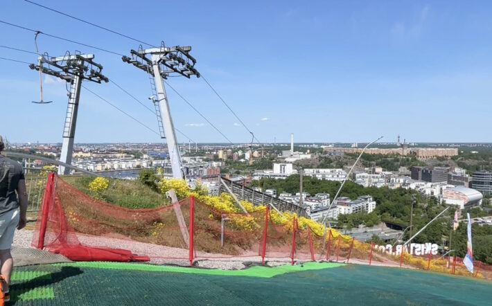 Jocke Olsson, lokal legend, gav oss ett gyllene råd: ”Så fort ni slutar tänka att det inte är som snö, så kommer det kännas som snö.” Och mycket riktigt, efter bara några åk började det kännas naturligt att ställa upp skidorna på kant och svänga ner mot den fantastiska utsikten över Stockholm.