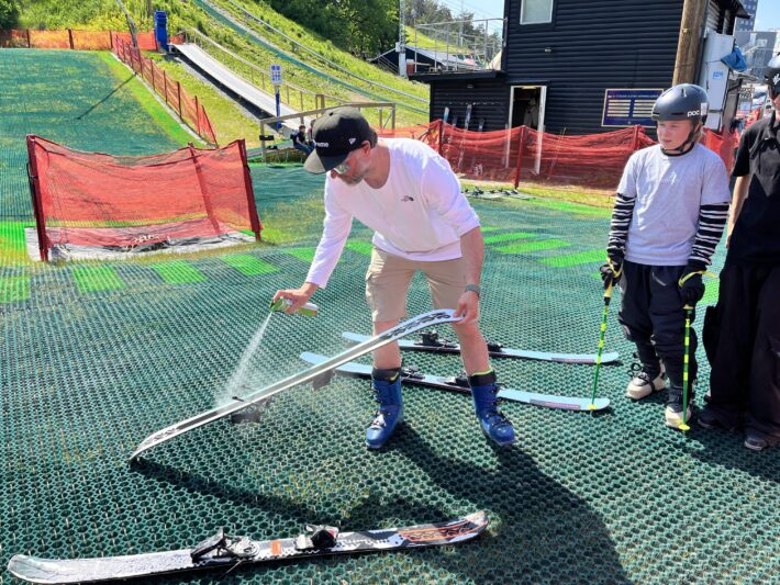 - Genom att skölja av skidorna i de små vattenspridarna vid liften håller man belagen kalla och blöta för maximal fart nerför backen