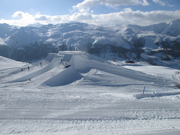 Av 100000 kubikmeter snö har arrangörerna byggt en 60 meter lång, 28 meter hög och 150 meter bred tävlingsarena med hopp, rails och andra features.