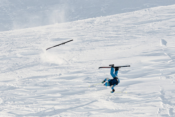 Jesper Björnlunds NM-deltagande fick tyvärr ett abrupt slut. Efter en respektingivande inledning i Insteget skenade skidorna iväg i landningen i Jespers andra drop och han började tumla. Sjukvårdare tillkallades och Björnlund fick ta sig ner med hjälp av en släde med en befarad korsbandsskada.