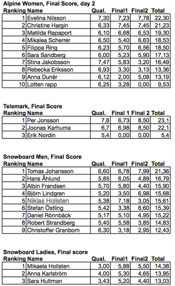 I damernas skidklass har Evelina Nilsson imponerat och är med största sannolikhet i ledningen efter dagens två åk. Christine Hargin gick stort och Stina Jakobsson hade ett ruskigt trevligt åk på gång i Ravinen men föll i landningen efter den sista klippan.