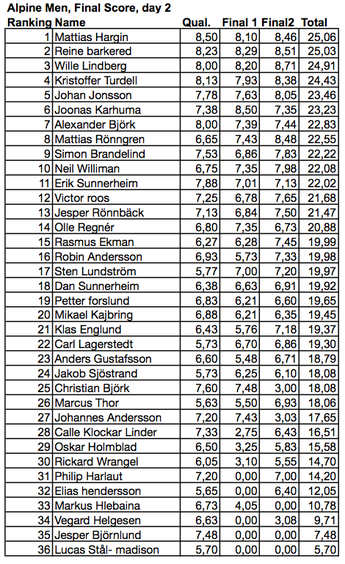 Nivån i herrarnas skidklass var hög. Riktigt hög. Backflips, 360’s, mycket fart och stora flygturer stod på schemat när det vankades finalåk. 18-årige Mattias Rönngren från Åre imponerade med två snabba och stabila åk och verkar inte ha orden obestämdhet och tvekan i sitt vokabulär. Rönngren, som inför onsdagen låg på en 23:e-plats, lär ha klättrat ett antal placeringar under onsdagen.