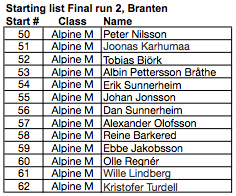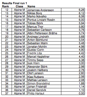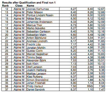 De sista fyra åkarna bevakade sina positioner med snabb, hyfsat stor men ändå kontrollerad åkning över Ögat. Överraskningen från igår, Olle Regnér, visade att gårdagens tredjeplats inte var någon tillfällighet och stod för ytterligare ett snabbt och stadigt åk idag vilket räckte till en fjärdeplats och en tredjeplats totalt inför avgörandet i morgon.