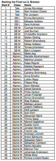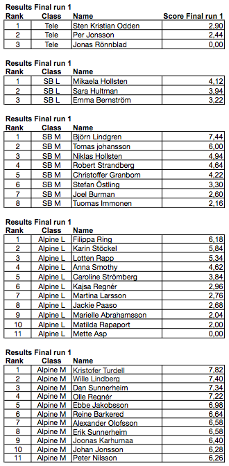 De som låg bäst till efter kvalet fick starta sist och vice versa. De tre telemarksåkarna var först ut och efter två lite försiktigare åk satte ledaren Per Jonsson ner foten och körde riktigt stort på den klassika klippan Ögat. Även om inte landningen satt kändes det ändå som att det var då tävlingen kickade igång på riktigt. Men det var Sten Kristian Odden som plockade hem dagens högsta poäng i telemarksklassen, 2,90 poäng. Per Jonsson behåller dock ledningen i klassen med god marginal inför sista finaldagen.