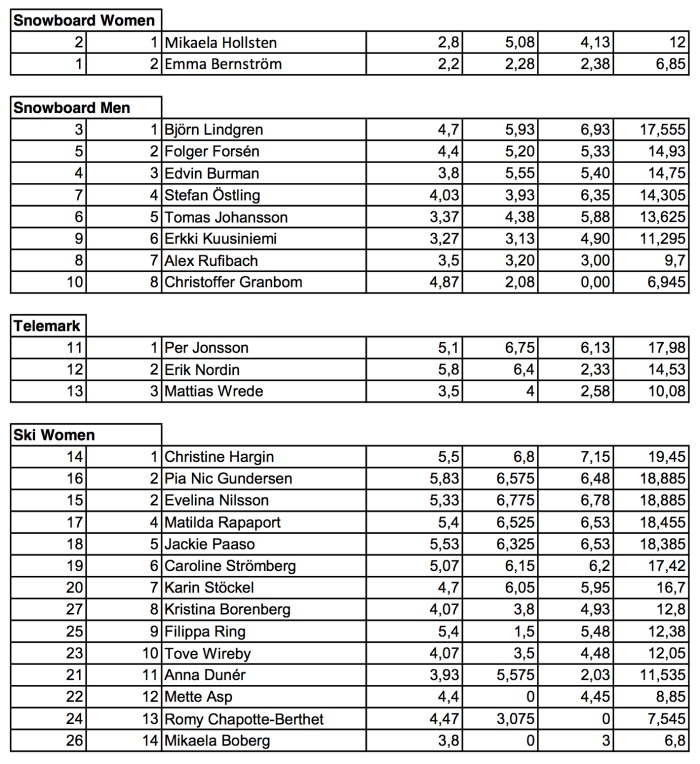 Och inte ville Kristoffer Turdell vara sämre. Även han inverterade i inledningen innan han satte full fart nerför den konvexa Branten. Möjligen att han saktade in lite innan de avslutande klipporna, men det var ett solitt åk som han avslutade med en 180 över skoterspåret, och med tanke på hur tätt det var i toppen innan dagens tävling är det svårt att gissa hur detta kommer sluta.