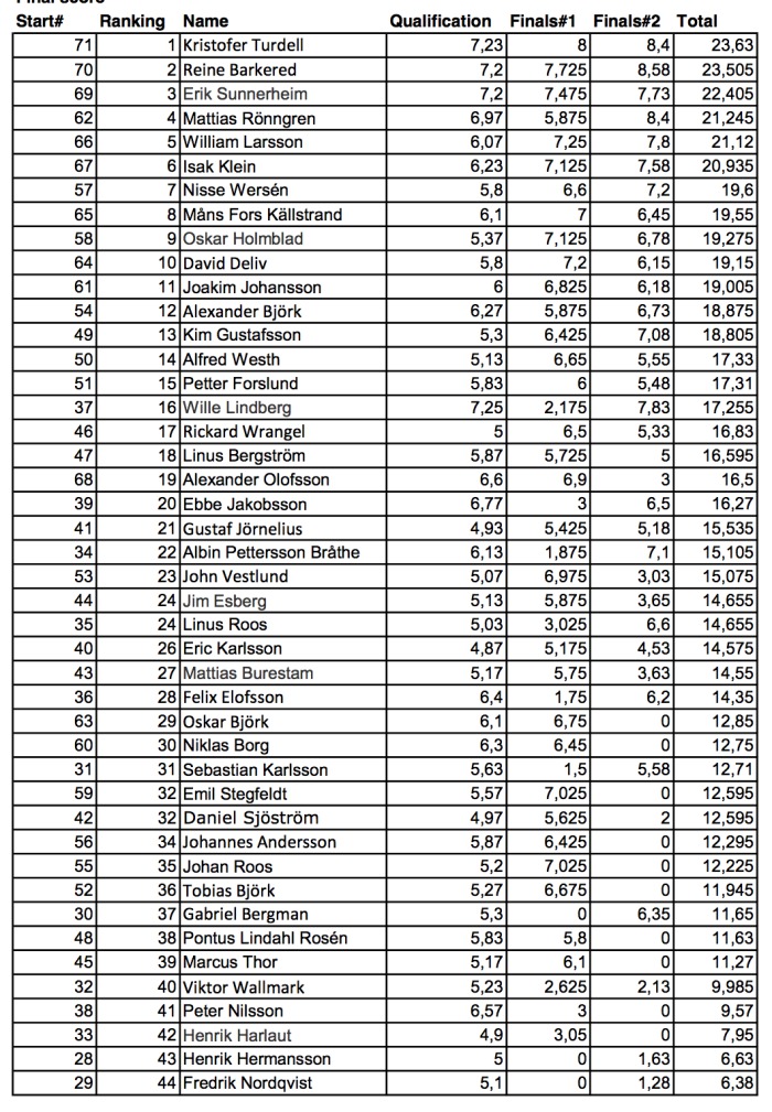 Herrfinalen bjöd på både stora dubbelstomp och vådliga vurpor, och även de lite längre ner på rankingen hade siktet inställt på show. Ebbe Jakobsson visade att gårdagens vurpa var en tillfällighet när han gick stort på klippan längst ut skiers right, Wille Lindberg som inte heller hade några resultat att bry sig om inledden med en stor backflip och flög vidare nerför Nordals i sisådär hundra knyck. Eric Karlsson stod för en av dagens dagens mest spektakulära räddningar när han kom fel och for switch utför en klippa, men likt en ninja eller katt fick fötterna åt rätt håll igen och landade oskadd.