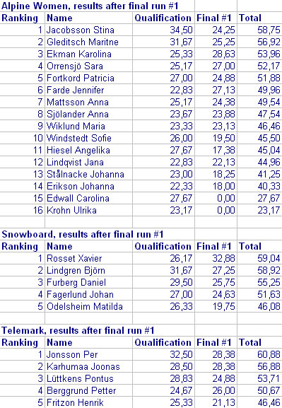 Vädergudarna var inte på arrangörernas sida under den första finaldagen. Dålig sikt och riktigt busväder medförde att endast halva startfältet kunde köra det första finalåket i ”Ravinen”. Efter damklassen så togs beslutet att inte fortsätta med den alpina herrklassen på grund av den dåliga sikten vilket samtliga nog tyckte var ett korrekt beslut. Men det hindrade inte Xavier Rosset i snowboardklassen från att åka en riktigt exponerad linje som förde upp honom i totalledning. I telemarksklassen så var det jämnt skägg mellan Per Jonsson och Joonas Karhumaa efter dagens finalåk men Per leder fortfarande totalt med fyra hela poäng.
