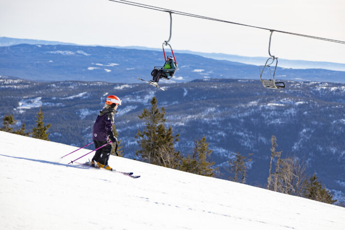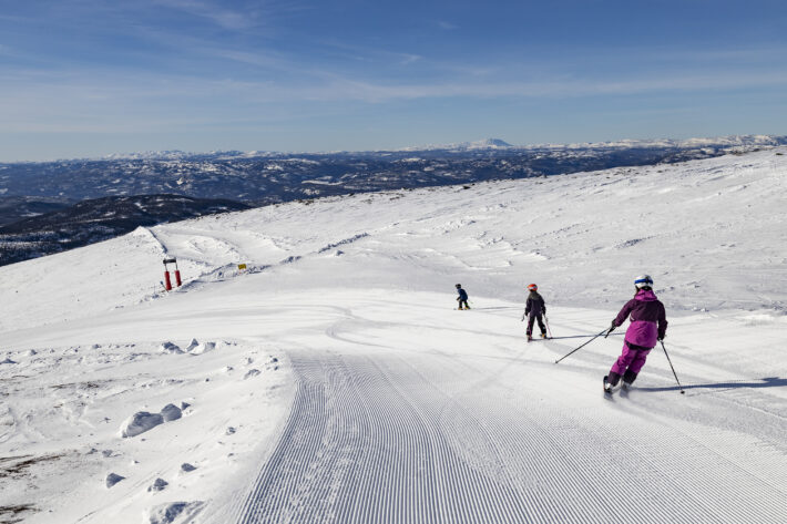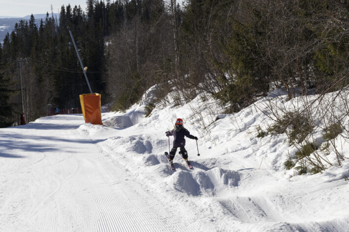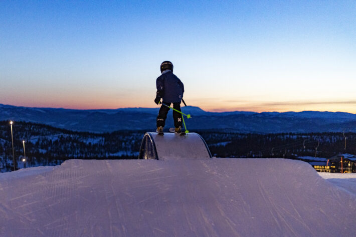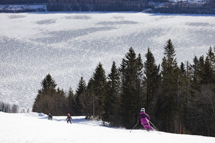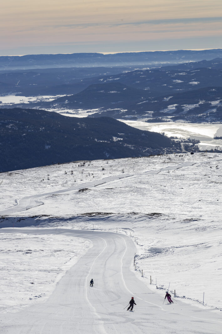 Meja hinner ta ett stavtag innan hon avslutar meningen. Hon gör ett par stora svängar i den blå pisten innan hennes skidspetsar byter riktning till rakt nedåt, mot sjön Krøderen. Farten blir högre och högre och till sist försvinner hon bakom ett hus. Jag följer efter och gör som hon, tar fart och rundar samma hus och tar mig nästan hela vägen till lifthuset. Där står Meja, hennes bror Leo och mamma Linn. Alla är trötta. Alla är glada. Vi har precis avslutat vad som förmodligen är Skandinaviens längsta pist på 7 kilometer.