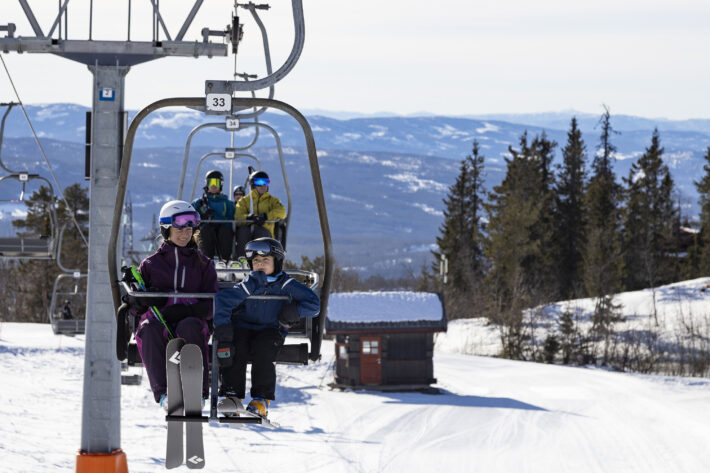 En halvtimme tidigare blickade vi ut från Ravnås på 1180 meters höjd som är Norefjells högsta punkt. Utsikten var minst sagt storslagen med panoramavyer över trädbeklädda berg, isbelagda sjöar och ett och annat kalfjäll. Mellanmålet kunde med andra ord inte ha avnjutits på ett bättre ställe. Hit tar man sig med hjälp av Ravnåsliften som segar sig upp 240 höjdmeter på 1,5 kilometer. Det är en jättelång lift. Den känns ännu längre med ett barn bredvid och en bygel strax under knävecket. Det provade båda jag och min fru.