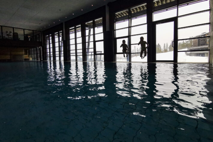 Poolen, som man får tillgång till genom att hyra lägenheten, ligger i huvudbyggnaden mitt emot lägenheten. Det går fort att ta sig dit. Det är fräscha och varma omklädningsrum. Det finns både bastu och bubbelpooler. Och själva poolen är ganska så stor, uppskattningsvis 15 meter lång med stora panoramafönster ut mot naturen. Ett schysst ställe för avkoppling helt enkelt. Ja, förutom när kidsen ställer sig på kanten, missräknar avståndet till de andra som badar, tar sats och gör bomben ner i poolen.