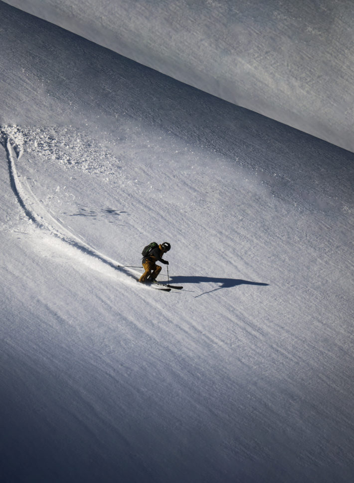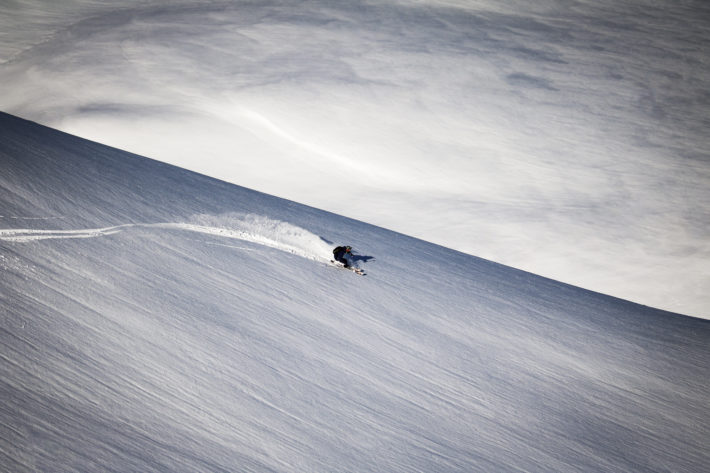 Vi tar några djupa andetag och inser att vi inte är vana vid så här bra snöförhållanden just under denna vinter. Därefter lossnar det, och vi bokstavligen pumpar puder resten av eftermiddagen. De decimetrarna av orörd fluffig nysnö som ligger har gjort gott och vi inser att tajmingen på resan är perfekt.