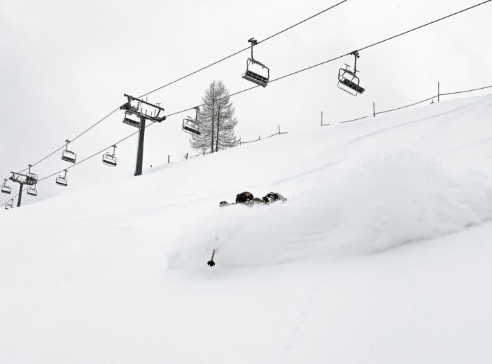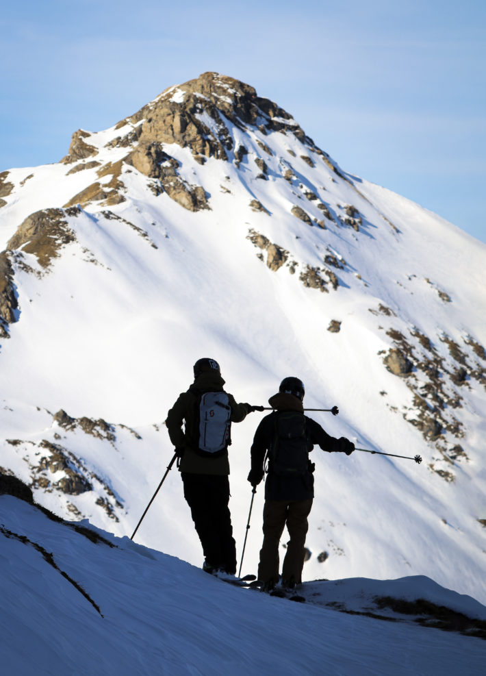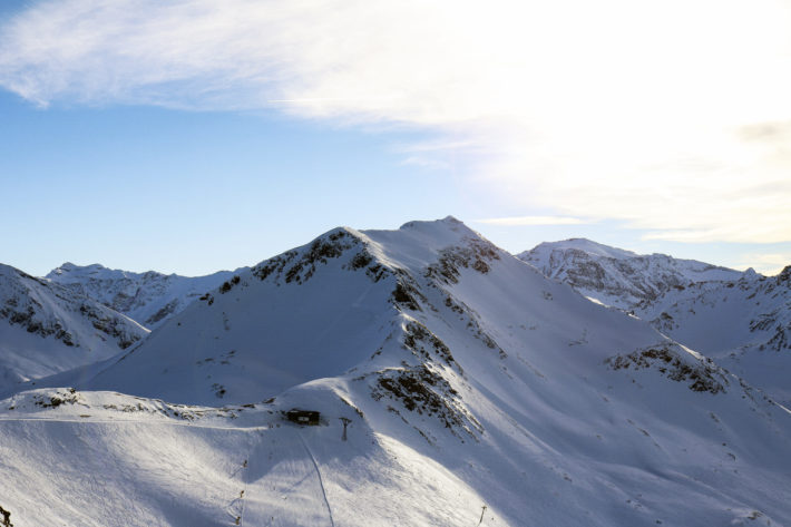 Gårdagens puder har, föga förvånande, regnat bort men Lorenz är fast besluten att hitta orörd kallsnö åt oss. Och det lyckas nästan. Efter att vi tagit oss upp med dubbla sittliftar till Hohe Scharte (2300 m.ö.h), passerat Mauskarkopf, Schlossalm (tävlingsface för Freeride World Qualifier) och därefter traverserat baksidan bort från den sista liften så är snön kall, men hård.