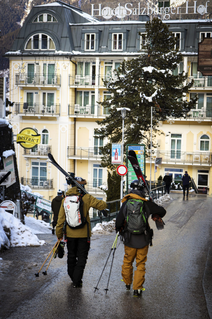 Med glada miner och trötta ben spatserar vi därefter genom den kulliga byn med skidorna på axeln. Det är gott om folk här, och det är gott om folk som likt oss knatar med skidorna på axeln… och vid en närmare analys så visar det sig också vara gott om skidor med ett midjemått under 70 millimeter, vilket i sin tur förklarar att vi fått åka ospårat trots att vi var långt ifrån först upp på berget idag.