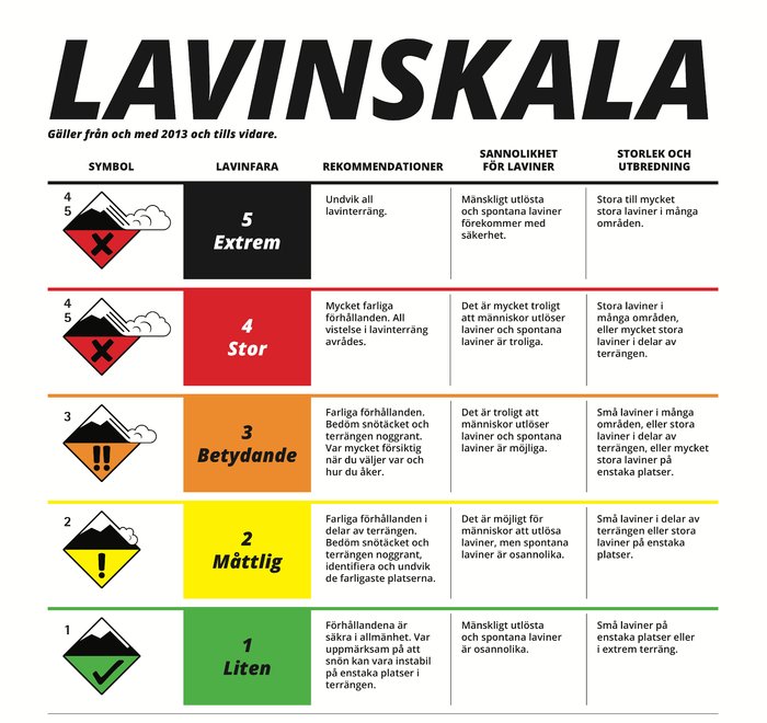 Nästa säsong införs en ny lavinskala i Sverige. Liksom vid den senaste uppdateringen, vintern 2003-2004, bygger den nya lavinskalan på den Nordamerikanska modellen.