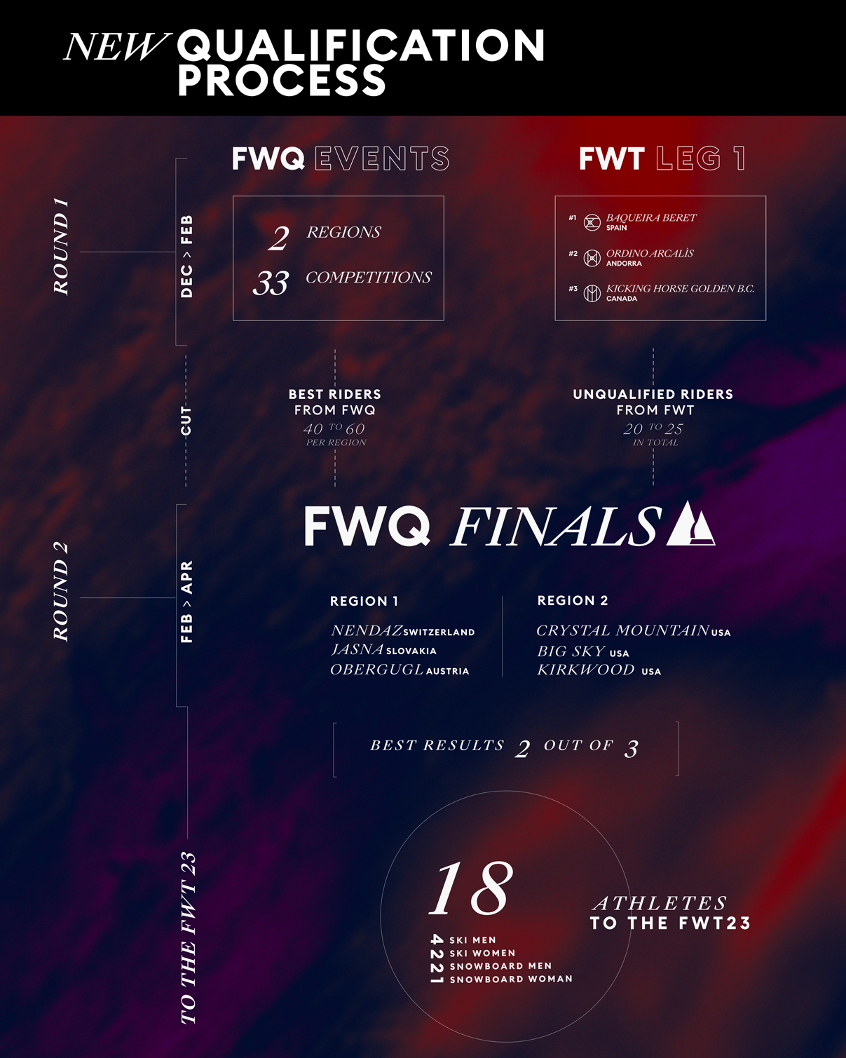 Dessa platser är sedan utdelade på två regioner; region 1 Europé Oceania och region 2 America. Det är alltså 9 åkare från vardera region som kvalar till FWT: 4 skidor herr, 2 skidor dam, 2 snowboard herr och 1 snowboard dam.