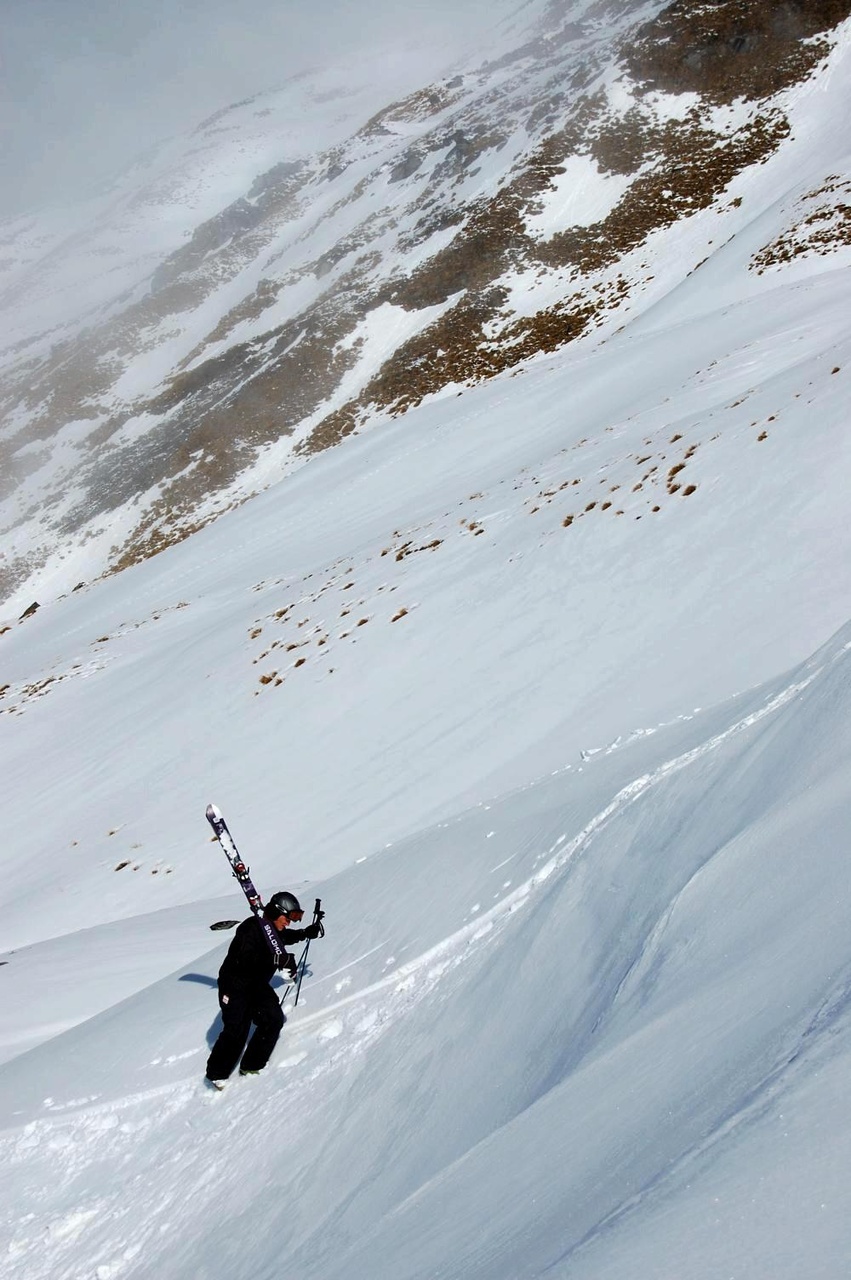 Vi tar oss igenom dimman uppför berget och just när vi kommer upp på parkeringen bryter vi igenom och solen skiner vackert mot oss, äntligen! Vi tar en kaffe på basstationen innan vi tar första liften upp och det känns som om det tar en evighet för baristan att göra klart kaffet. Det har kommit 15 cm snö under gårdagen vilket är relativt mycket för området och vi tar några åk i Saddle Basin som uppvärmning, solen bränner bra och det blir snabbt tung vårsnö så vi söker oss längre upp i området och tar en hike upp till Treble Cone Summit för att komma åt bättre snö. Efter en tung förmiddag med kramp i låren bestämmer vi oss för att ta lite bilder i Hidden Valley på eftermiddagen innan vi än en gång skall pumpa ut den sista energin ur benen.