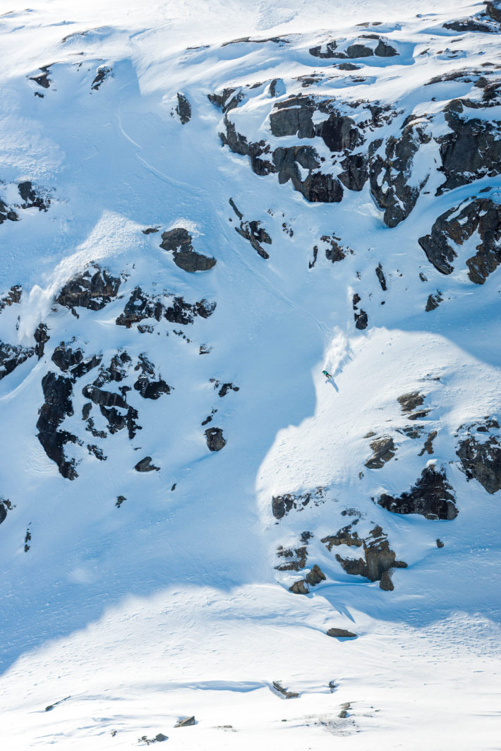 Kanten är på vissa ställen klippa och vissa ställen snö, och det är bäst att åka ned till en sten kant lite mer till vänster först för att slå en kik. Ser det ut som en sträng med snö som går diagonalt ned till vänster, med en stenbumling mitt i, så har du hittat rätt. Insteget är mer till höger. Håll vänster fram tills åket gör en naturlig sväng, och där kan man köra rakt ned eller lite lite till höger. Var uppmärksam på sluff, svallis, vindpinad snö och eventuell lite bergsschrund.