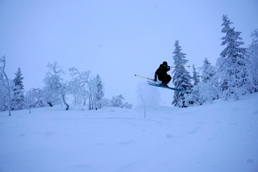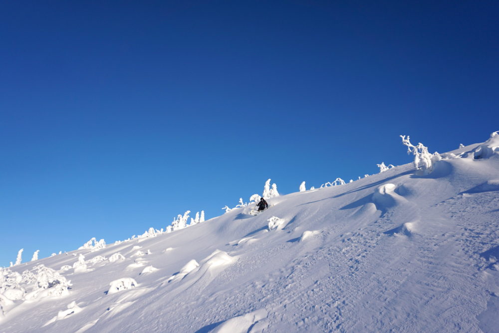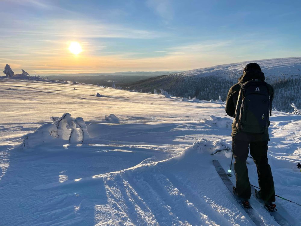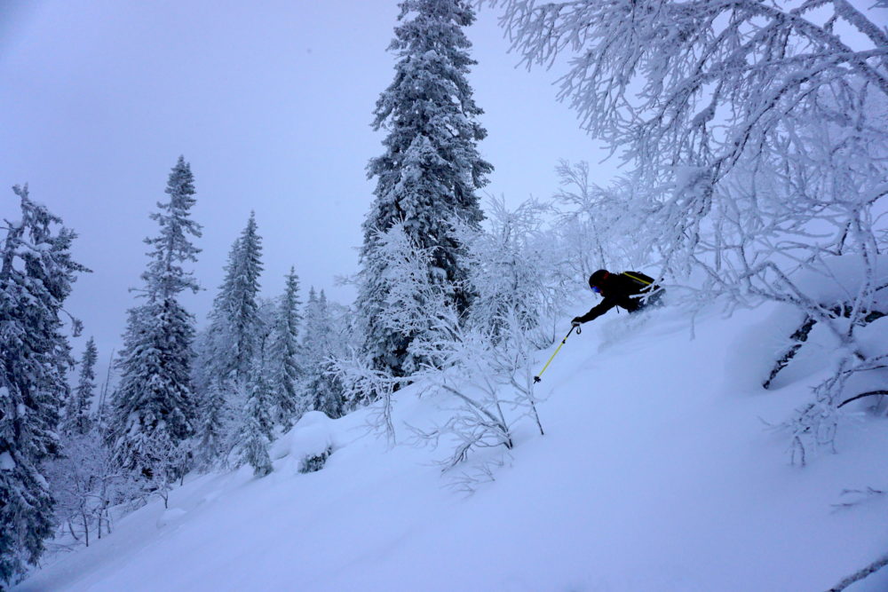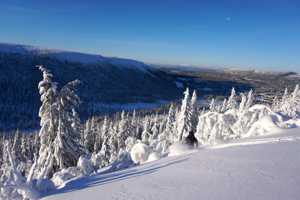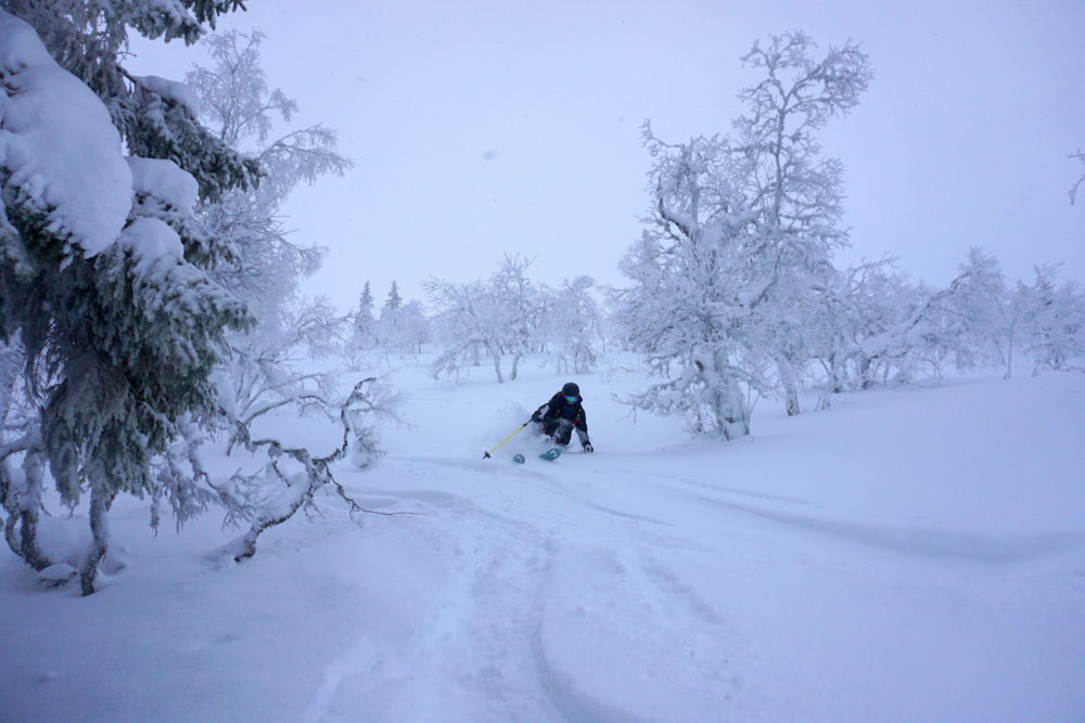 Från kalfjäll, in bland gles fjällbjörk. Vidare ner igenom granskogen för att slutligen stanna på längdspåren nedanför. Jag vet inte hur många gånger vi utbrister i kommenterare som: ”Är det här Kanada eller Sälen”? Eller: ”Jag visste inte att Niseko låg i Dalarna”. Det låter så klart som en överdrift, vilket det säkerligen var till en viss del. Samtidigt så säger det en hel del om vilket magiskt åk det här är och vilka oslagbara förhållanden det var i slutet av januari.