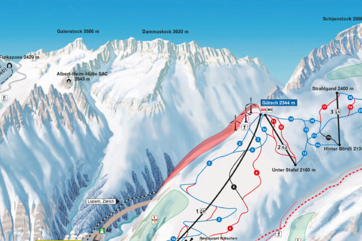 Rekommendationen är att du tar dig hela vägen ned till Hospental (buss tillbaka) genom att åka längs en väg på 1600 meters höjd. Under säkra förhållanden kan du ta dig direkt till Gemsstock-dalstation, men se till att ha brantare backarna ovanför dig i åtanke.
