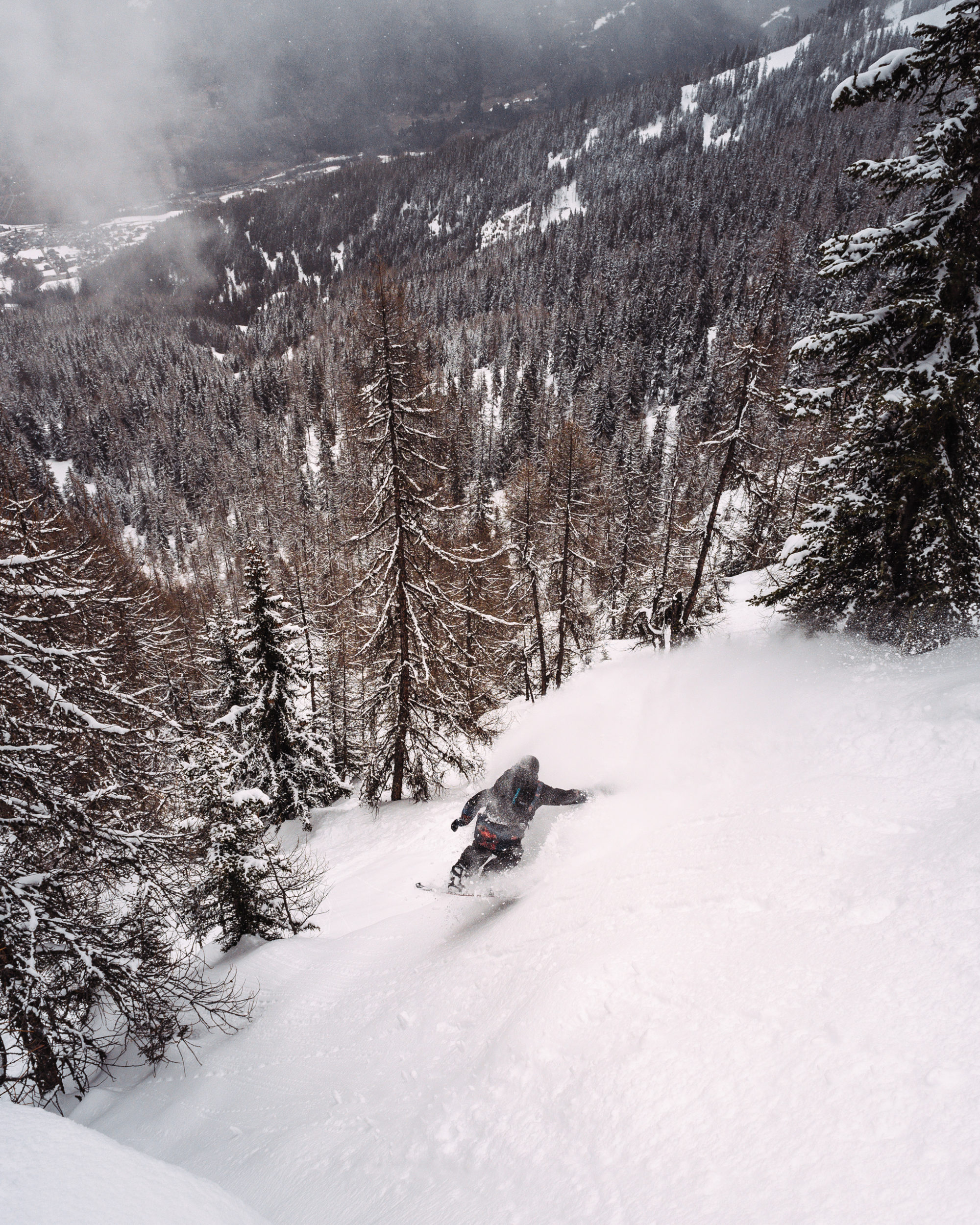 Dagen där på har Cody fått tag på sin bräda och vi möts alla tre på toppen av Medran-liften. Tillsammans kliver vi in i en av gondolerna som utgör liften Funispace. På toppen dyker David Deliv upp, kollegan från kvaltouren är på jakt efter stora klippor att dropa. Vi är också på jakt efter stora klippor att dropa, men också på jakt efter fickor med pudersnö och solbelysta spines att lägga svängar i och på.
