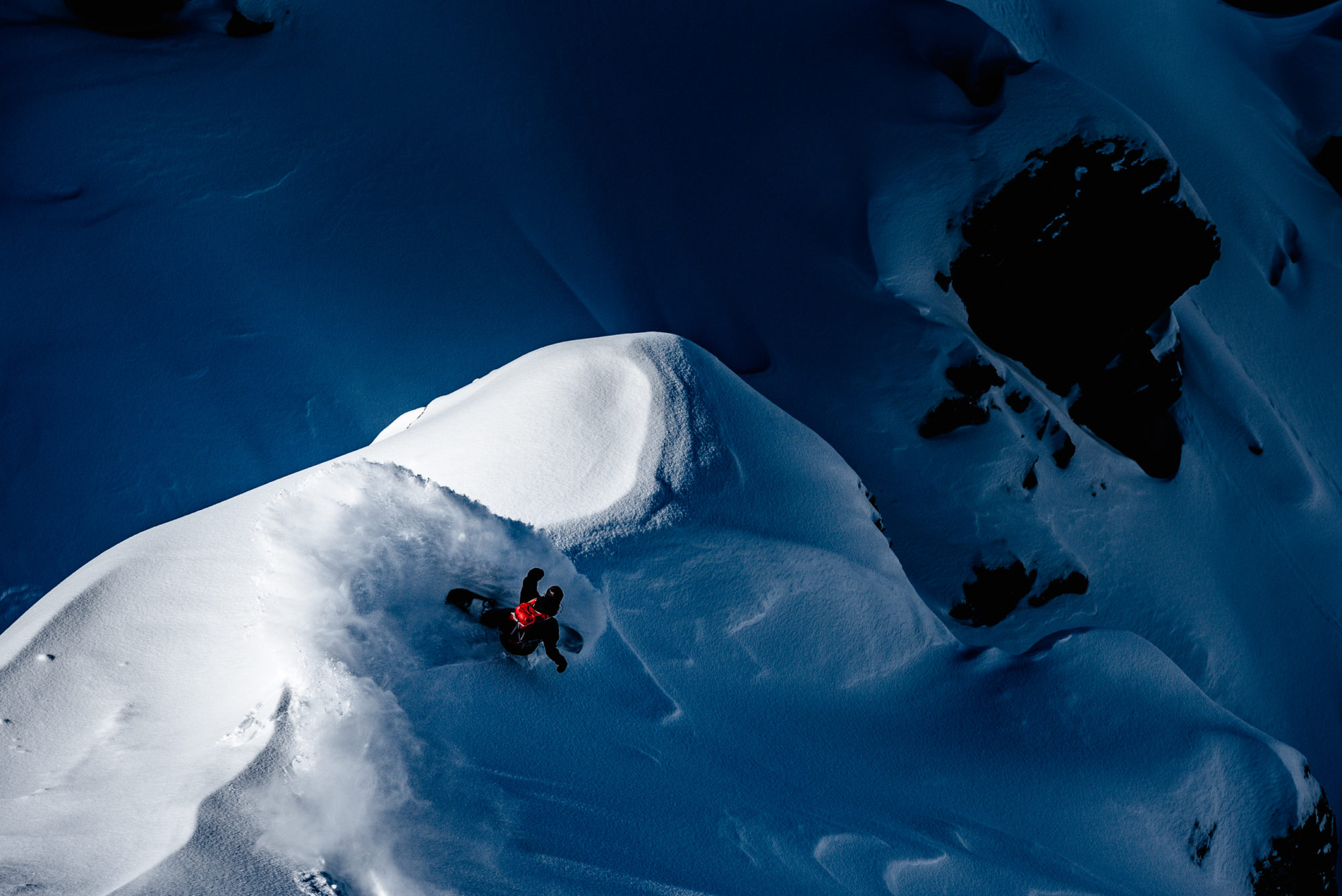 Första åket snubblar du nästa över när du kliver ut från liften. Bakom lifthuset finns ett klippigt och stenigt parti som vi ska skida ned för. Med en tung ryggsäck är det svettigt att ta sig ned, men för en råbarkad freerider är det en lekstuga av modell bättre. De tre åkarna tar sig ned lekande lätt till den öppnare och betydligt flackare snöfältet nedanför klipporna.