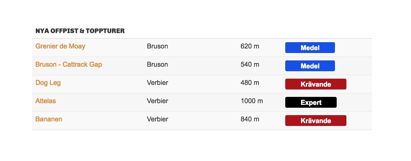 Med den i sammanhanget seniora snowboardåkaren Granbom i spetsen och de något mer juniora åkarna Adam Björk och Cody Bramwell tätt bakom har några av pärlorna till åk betats av. Dessa presenteras nedan för dig som vill utforska mer än den svettiga puckelpisten som leder ned från toppen av Mont Fort. I Bruson åkte vi Grenier de Moay och Cattrack Gap, inne i Verbier huvudssystem körde vi Attelas, Bananen och Dog Leg.