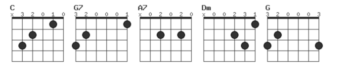 Inte nog med denna text-service. Vi kan också avslöja att piano- eller gitarkompet går i ackorden C, G7, C, G7, C, A7, Dm, G, G7, C. Här ovan ser du hur du greppar ackorden på gitarren. Åh, ett två tre och: