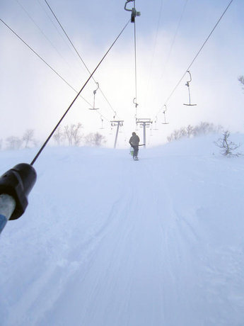 Och det är verkligen så här. Det har snöat massa de senaste dagarna och liften har redan varit öppen i omkring 20 minuter när vi står där nedanför. Men inga människor har åkt upp än. Helt sjukt! Ingen tid att spilla, vi parar ihop oss två och två i ankarliften och påbörjar vinterns första liftåk.