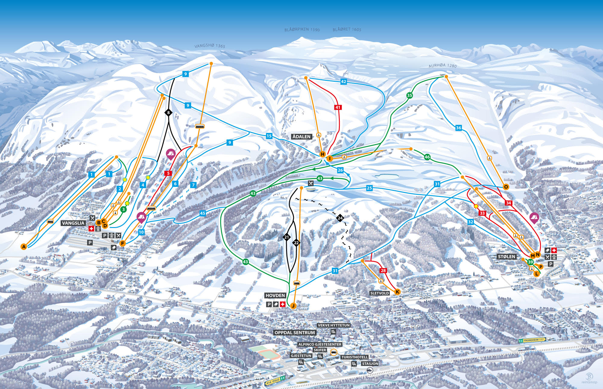 Oppdal är mer än ett skidområde. Det är snarare ett helt fjällmassiv uppdelat i fyra områden: Vangslia, Stølen, Hovden och Ådalen. Tillsammans bildar de en av Norges största skidområden med 56 kilometer preparerade pister och 16 liftar som knyter samman terrängen.
