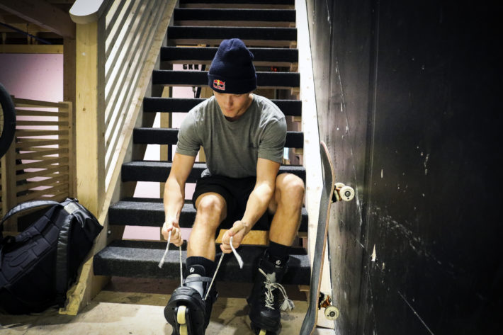 Efter avslutad intervju rusar Oscar iväg och hämtar ett par alldeles för stora inlines och beger sig in mot rampen och skumgummigropen. Landslagskollegorna Jennie-Lee Burmansson och Oliwer Magnusson kommer rullandes på varsin skateboard respektive BMX-cykel. Det är en lekfull stämning och hela Dome Adrenaline Zone är en tillsynes stor lekstuga med det svenska landslaget i spetsen denna glada dag. Bilden av den strikta och inrutade sporten bleknar något… stämning är ”hangloose”, och det är glädjande!