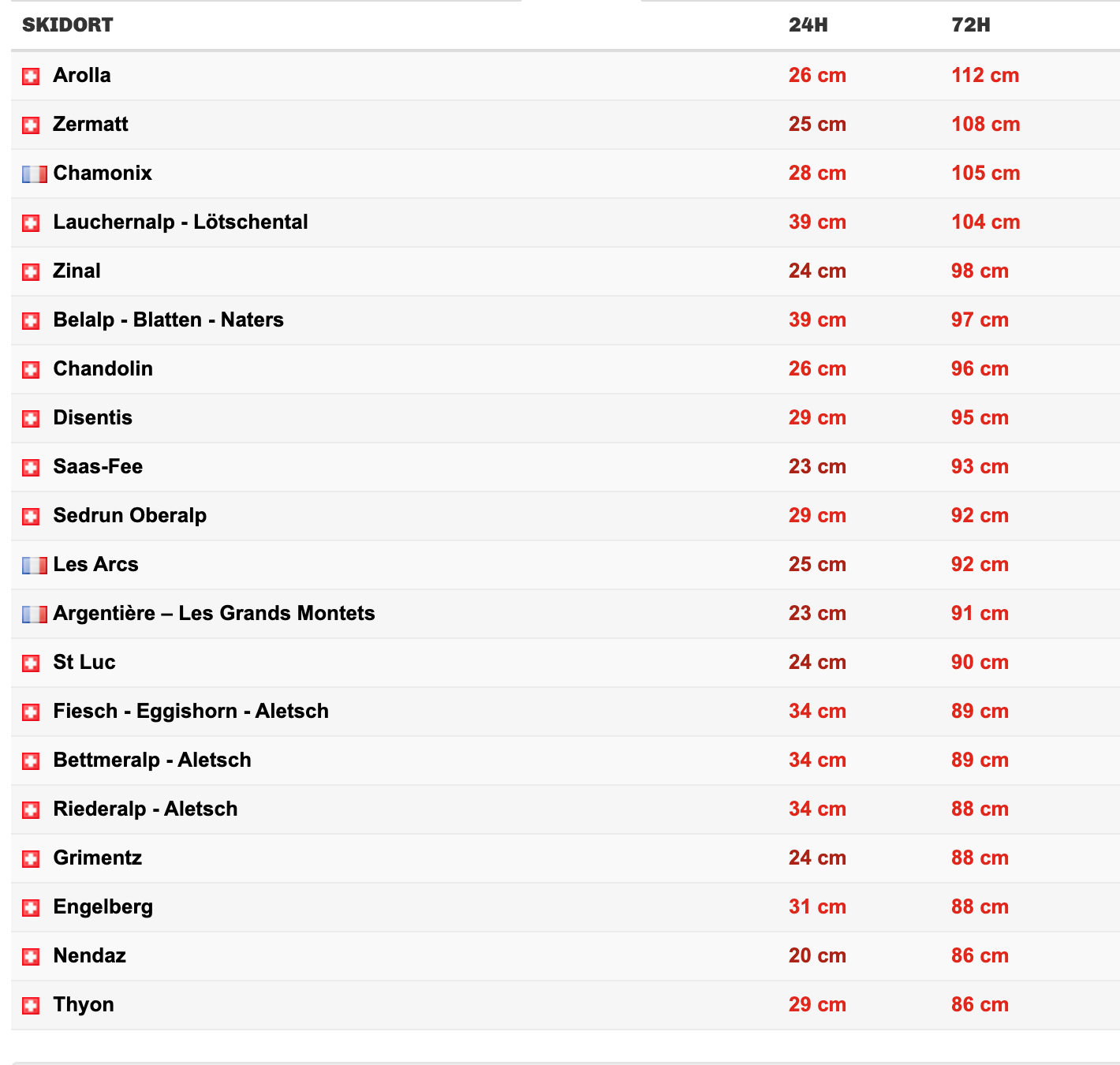 Just nu ligger Zermatt och Chamonix riktigt fint till, här är topp tjugo skidorter i Europa utifrån förväntat snöfall kommande 72 timmarna.