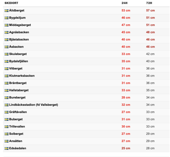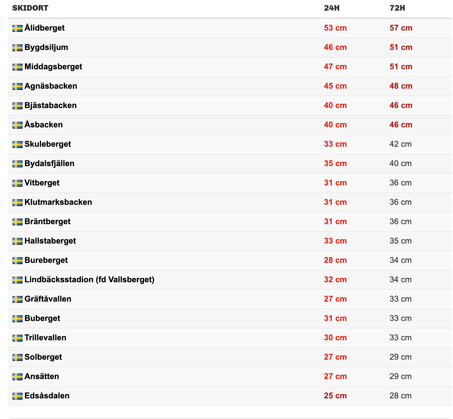 I Sverige väntas också mycket snö, upp emot halvmetern på flera mindre skidorter som Ålidberget och Bygdsiljum. Bydalsfjällen i Jämtland, sydöst om Åre väntas få 4 decimeter.