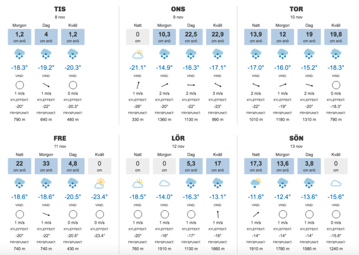 Ser vi på toppen av Chamonix, långt ovan fryspunkten som ligger mellan 300 och 1500 meter de kommande dygnen, så är det imponerande snöfall. Över en halvmeter på onsdagen följs upp av 60 cm på torsdagen och ytterligare en halvmeter på fredagen. Lägg därtill 20 cm på lördag och 30 på söndag så har du en snöfest till och med jultomten skulle vara imponerad av.