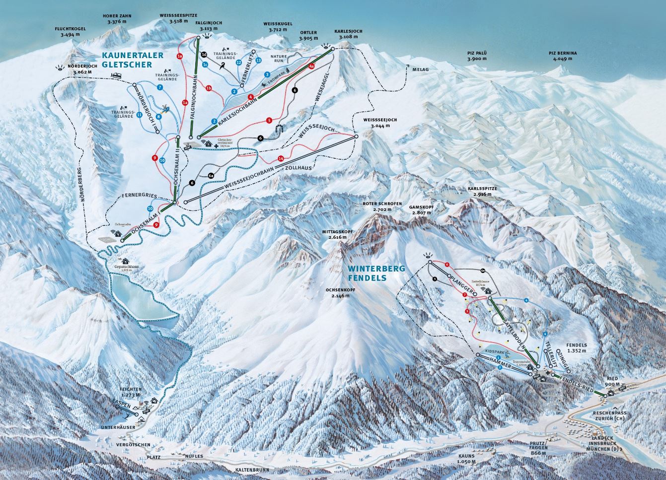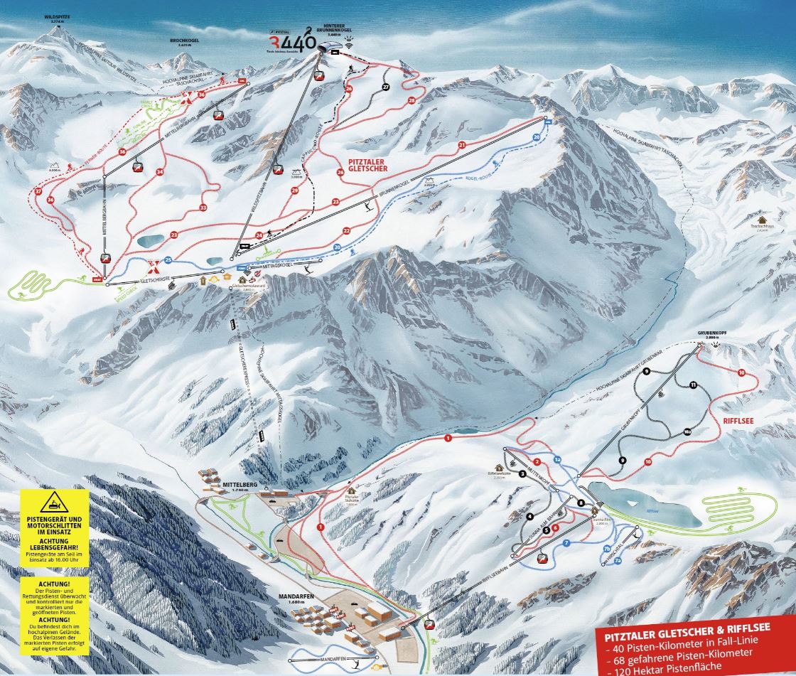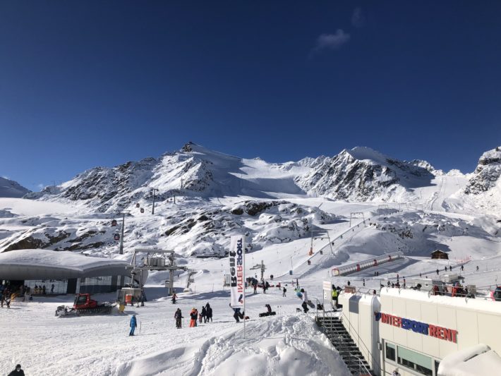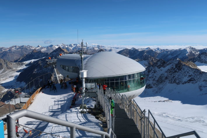 När vi kliver ut här kan vi blicka ut över de flesta liftar och nerfarter i skidområdet. Till höger ser vi den långa släpliften Brunnenkogel som når 3.230 möh. Till vänster lite längre bort skymtar vi Gondolen Mittelbergbahn som når 3.290 möh, och i mitten kronan på verket – Wildspitzbahn – som når toppen av berget Hinterer Brunnenkogel med imponerande 3.440 möh och därmed öppnar för Österrikes klart högst belägna skidåkning.