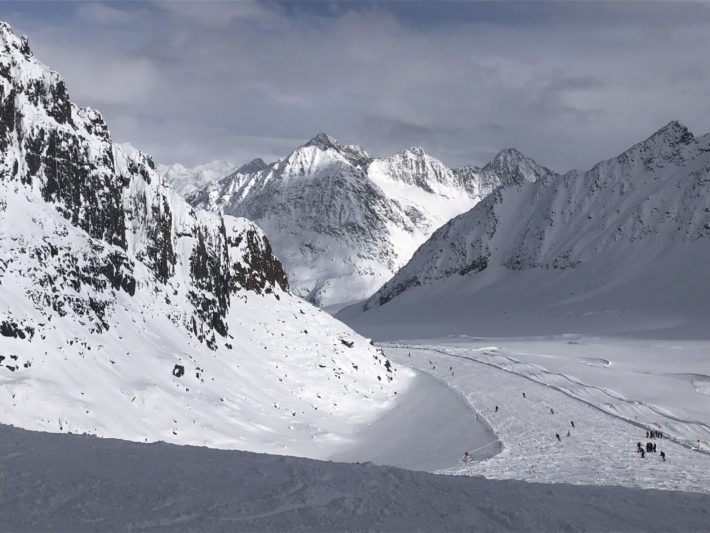 In med pistskidorna i hotellkällaren och fram med allmountainlaggen Salomon QST 99:orna. Uppe efter avstigning med Gletscherexpress blir vi nästan bländade i det starka reflekterade solskenet på glaciären. Vi väljer att börja dagen med den korta nerfarten ner till Mittelbergbahn och sedan åka upp med den liften. Vid avstigningen blickar vi upp mot Wildspitzmassivet och hälsas välkomna av de massiva glaciärerna som vältrar sig ner från över 3.700 meter.