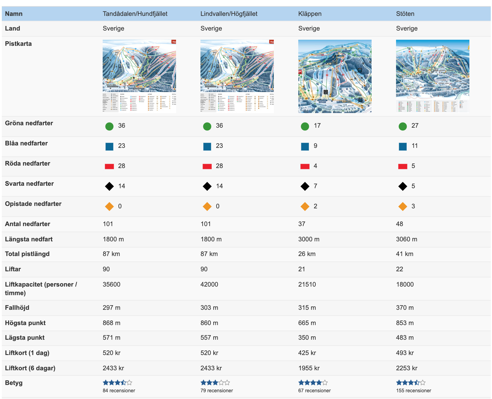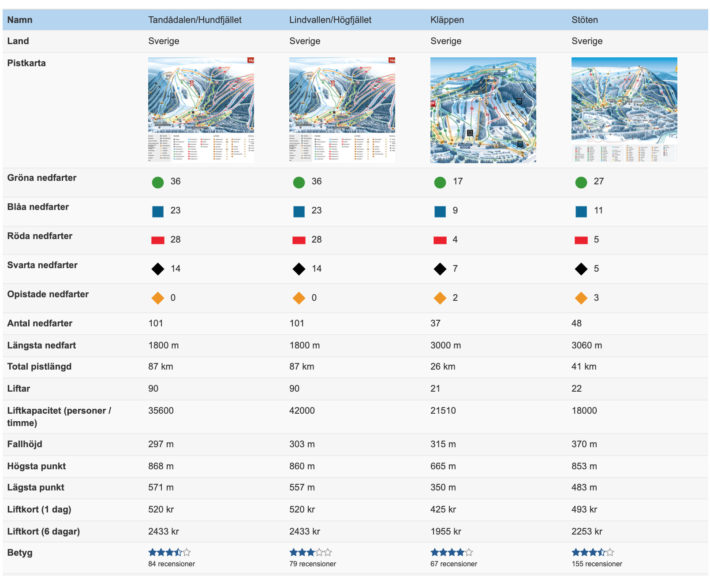Lite Off Topic (OT som de säger på forumet) men en annan rolig sak man kan roa sig med är den nya funktionen ”Jämför” där man till exempel kan lägga fyra små gulliga Sälenfjäll jämte varandra för att skärskåda deras siffror.
